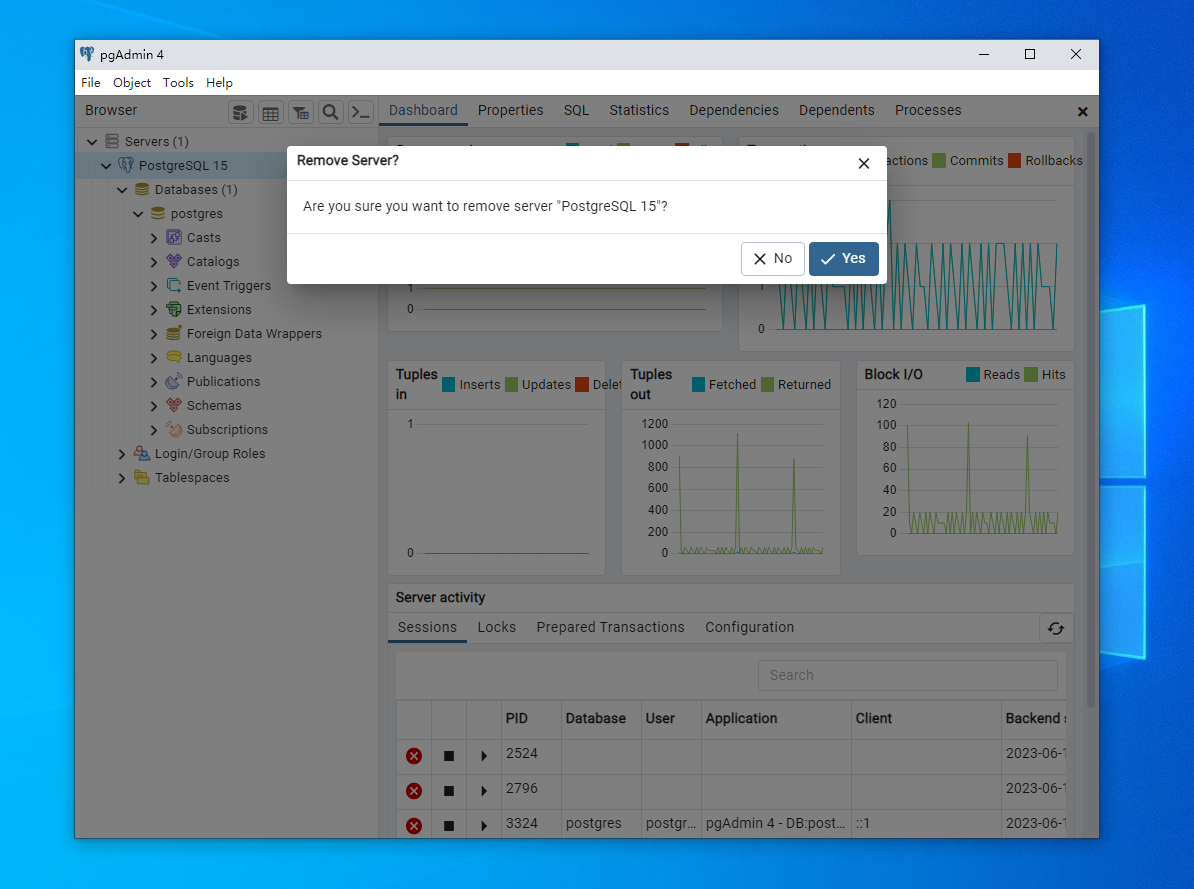 3.關(guān)閉文檔并選擇保存,然后再回到網(wǎng)絡(luò)版數(shù)據(jù)庫,右鍵點(diǎn)擊postgresql 15,在展開菜單中左鍵點(diǎn)擊remove server,然后選擇yes,就能重啟服務(wù)器(重啟需要一段時間)。