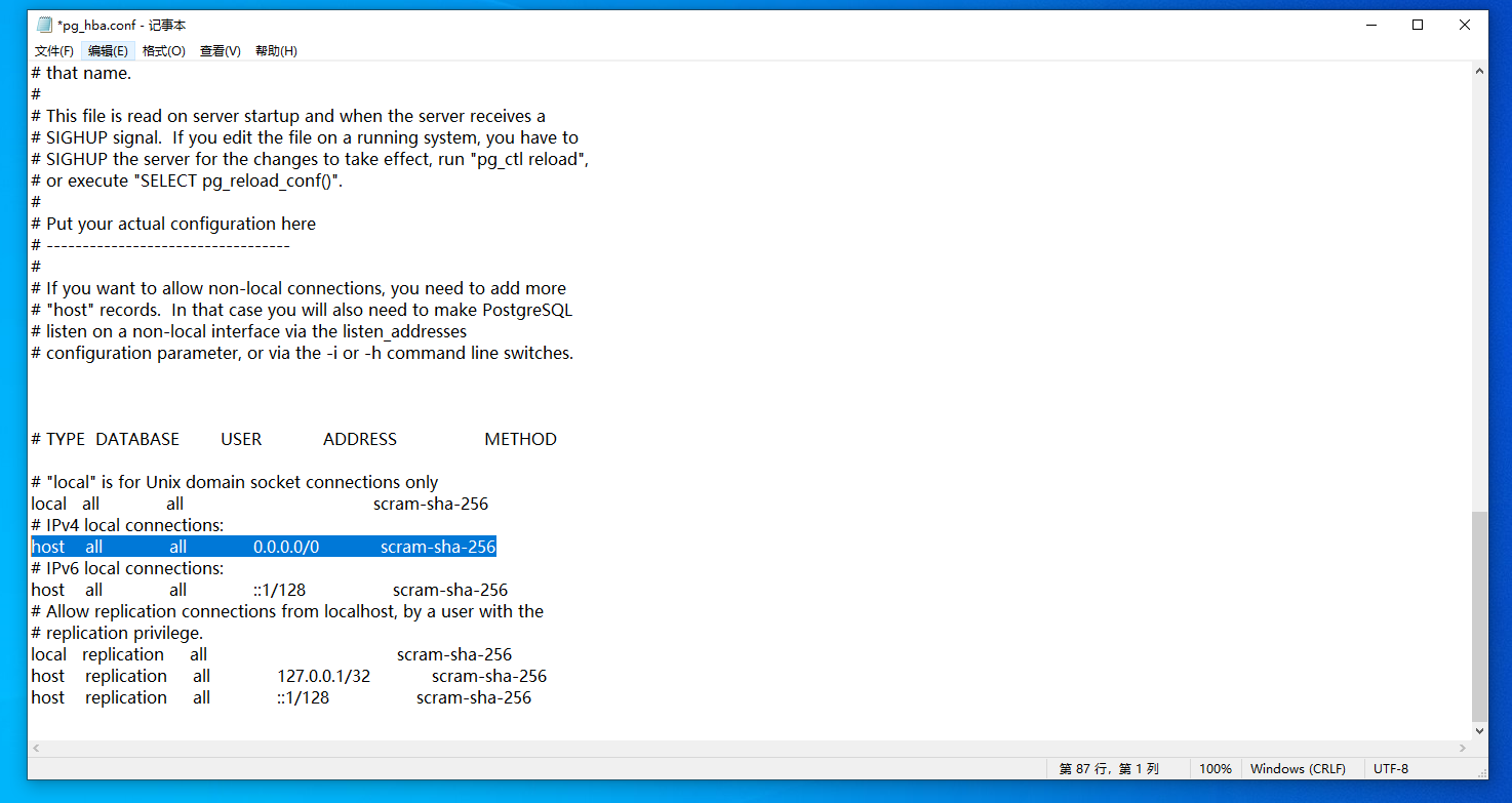 1.打開以下路徑,默認(rèn)為C:\Program Files\PostgreSQL\15\pgAdmin 4\bin,并選擇以文檔方式打開pg_hba.conf
