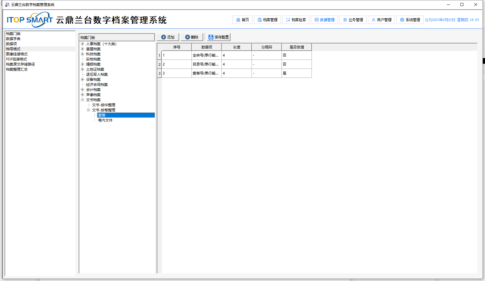 1,點擊檔號格式,選擇需要配置檔號格式的檔案門類,點擊添加進行檔號格式配置,案卷級檔案的案卷配置案卷檔號,案卷號是否自增選擇是,卷內(nèi)文件配置卷內(nèi)檔號,順序號或件號是否自增選擇是。一文一件級檔案只需配置檔號,件號的是否自增選擇是。記得配置完成后一定要點擊保存配置。(檔號的格式以實物為準,且檔號組成必須為已添加的數(shù)據(jù)項)