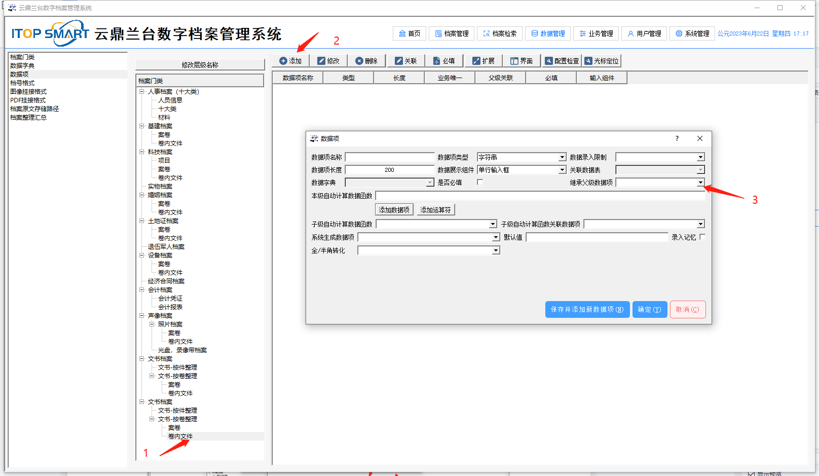 點擊創(chuàng)建的一文一件級檔案,點擊添加進行數(shù)據(jù)項的配置,配置完成后點擊擴展進行匹配,完成數(shù)據(jù)項的配置。