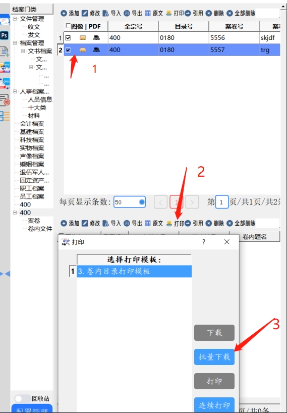 注意:在打印卷內(nèi)目錄的時候先點擊選擇需要打印的案卷,再點擊卷內(nèi)界面的打印,就會打印已選擇的案卷的卷內(nèi)目錄,可以選擇多個案卷進(jìn)行批量打印。