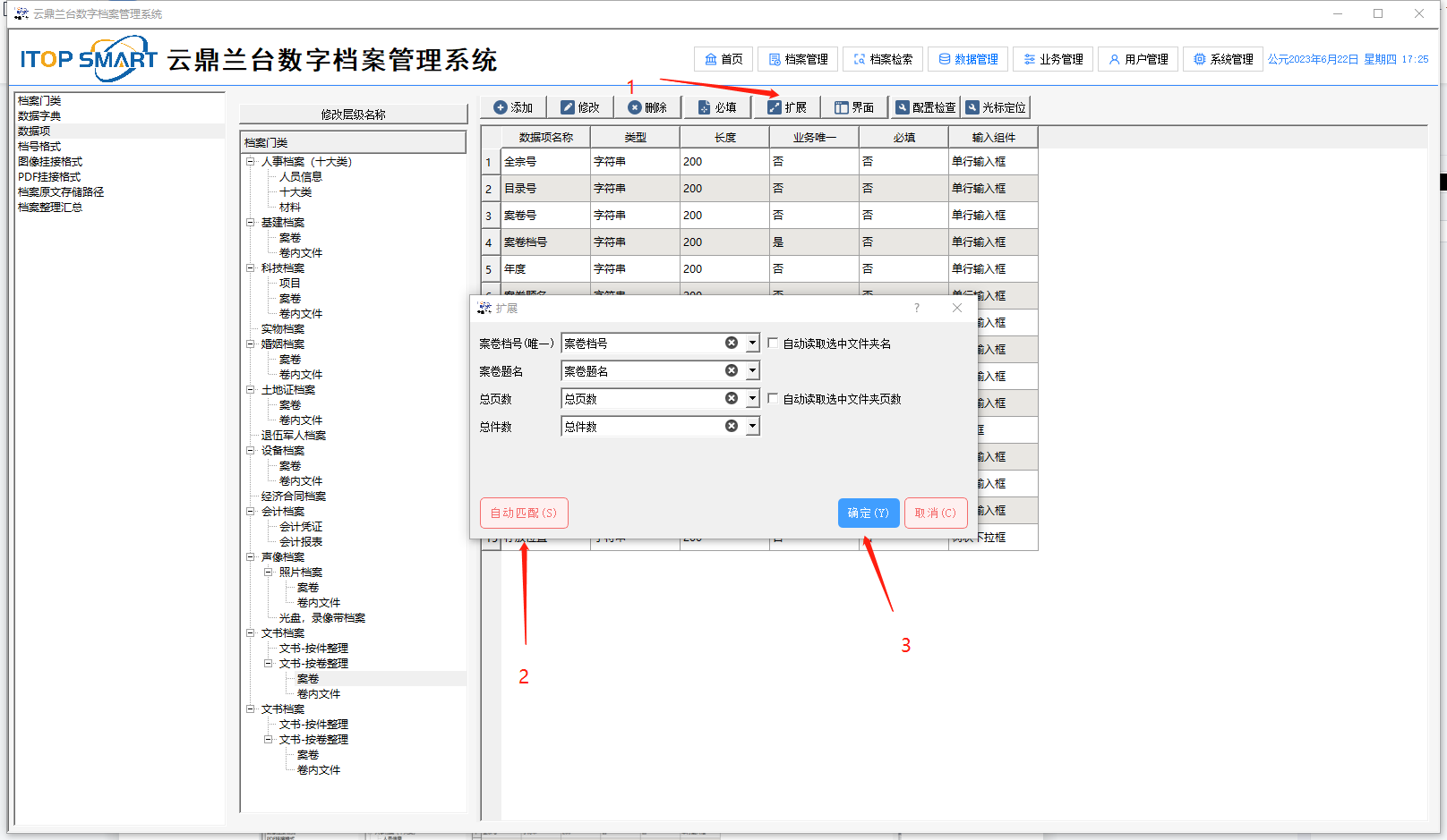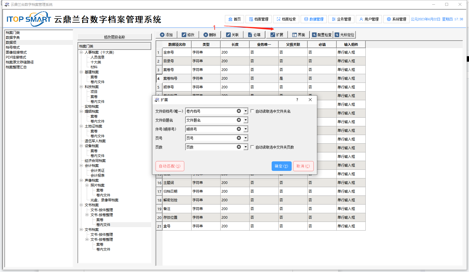 配置完成后點擊擴(kuò)展,在彈出界面點擊自動匹配進(jìn)行拓展,若因數(shù)據(jù)項名稱差異配匹配失敗可手動選擇,匹配完成后點擊確定,案卷數(shù)據(jù)相配完成。