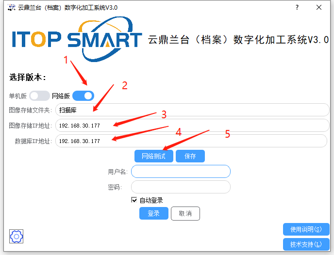 (1),點擊選擇網(wǎng)絡(luò)版,圖像存儲文件夾輸入已共享的文件夾名稱,圖像存儲IP地址輸入文件夾所在電腦的IP地址,數(shù)據(jù)庫IP地址選擇建立網(wǎng)絡(luò)版數(shù)據(jù)庫的電腦的IP地址,點擊網(wǎng)絡(luò)測試看是否鏈接成功。