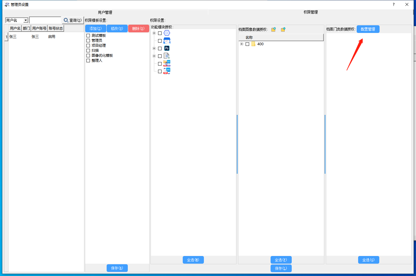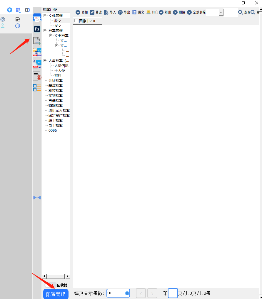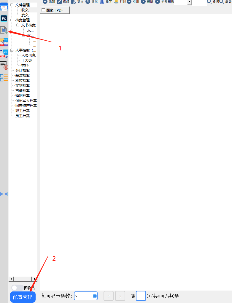 (1)點擊檔案門類數(shù)據(jù)授權(quán)后的配置管理進(jìn)入數(shù)字檔案管理系統(tǒng),