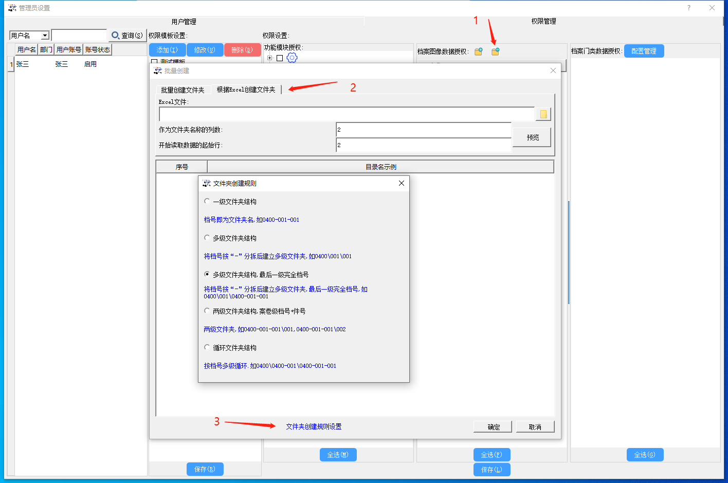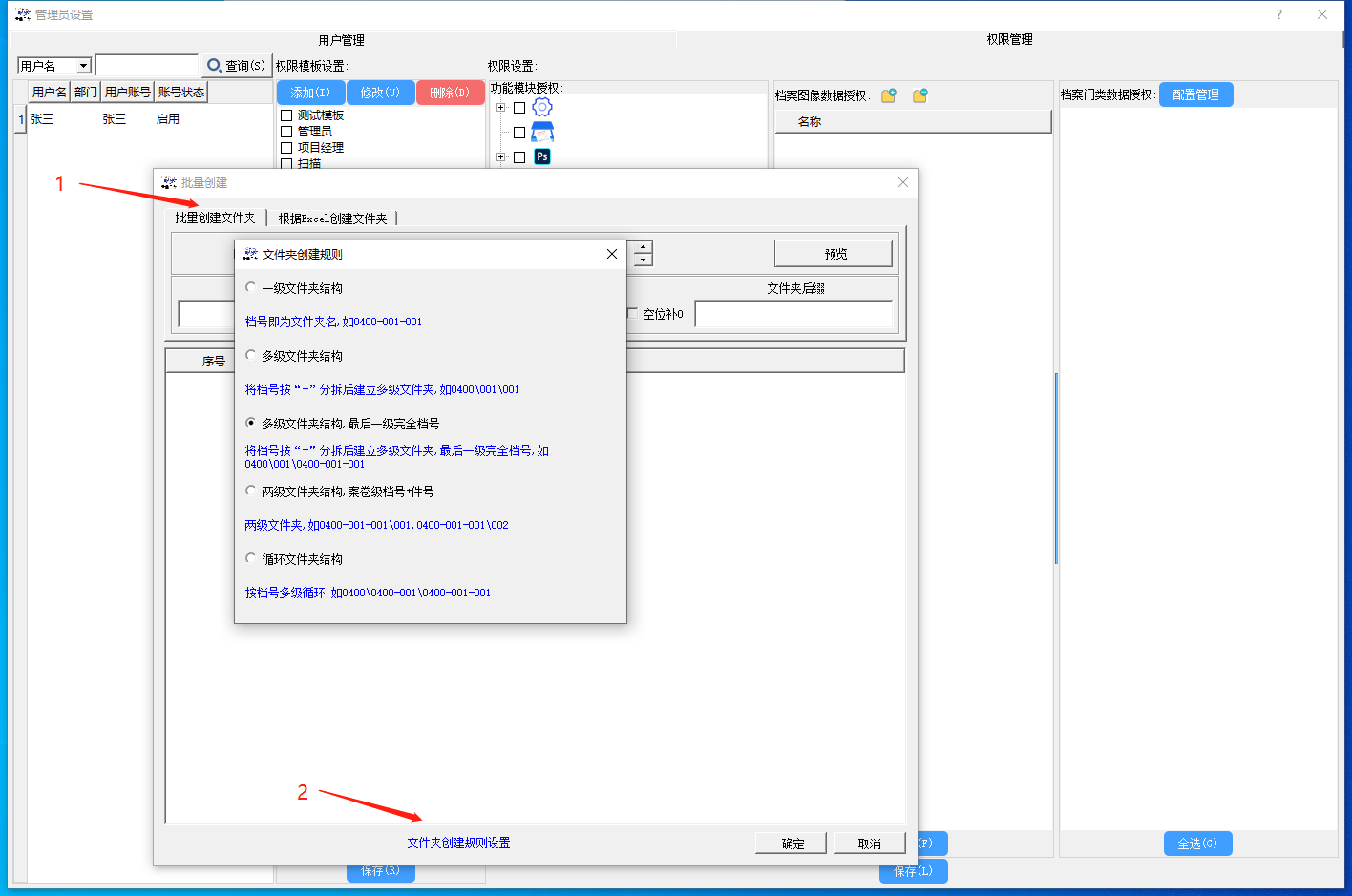 (3),也可以選擇批量創(chuàng)建文件夾,點擊檔案圖像數(shù)據(jù)授權(quán)后的第二個文件夾圖標(biāo),點擊彈出界面下方的文件夾創(chuàng)建規(guī)則設(shè)置,在彈出界面根據(jù)自己的需求選擇文件夾創(chuàng)建規(guī)則(這里的演示我們選擇多層級文件夾結(jié)構(gòu),最后一級完全檔號)。