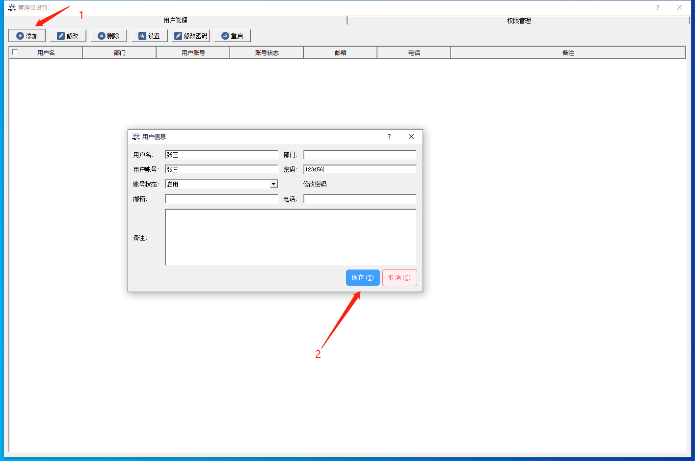 (3)進(jìn)入管理員設(shè)置界面,點擊添加,彈出用戶信息界面,輸入用戶名,用戶賬號,密碼,點擊保存,這樣就完成了一個賬號的創(chuàng)建。