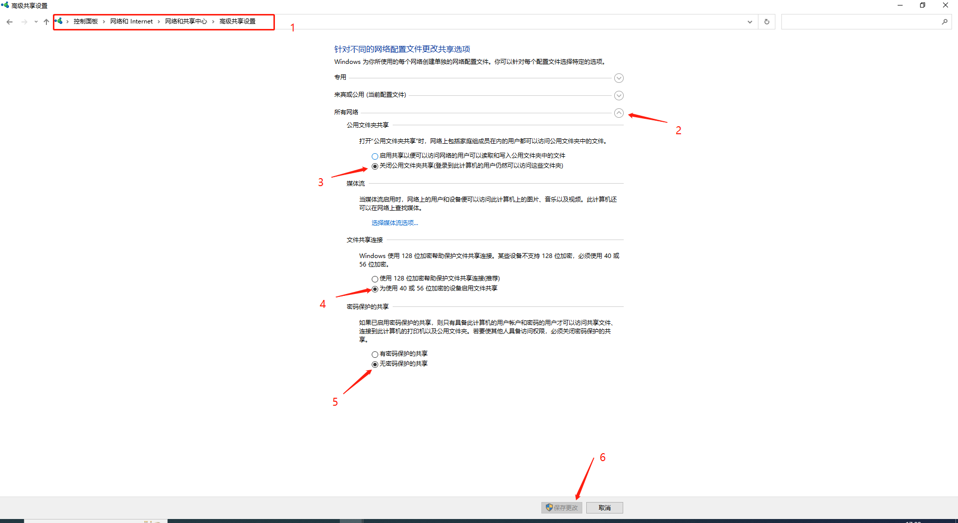 (4)打開以下路徑:控制面板\網(wǎng)絡(luò)和 Internet\網(wǎng)絡(luò)和共享中心\高級共享設(shè)置,點開所有網(wǎng)絡(luò)下拉選項,點擊選擇以下選項,保存更改。