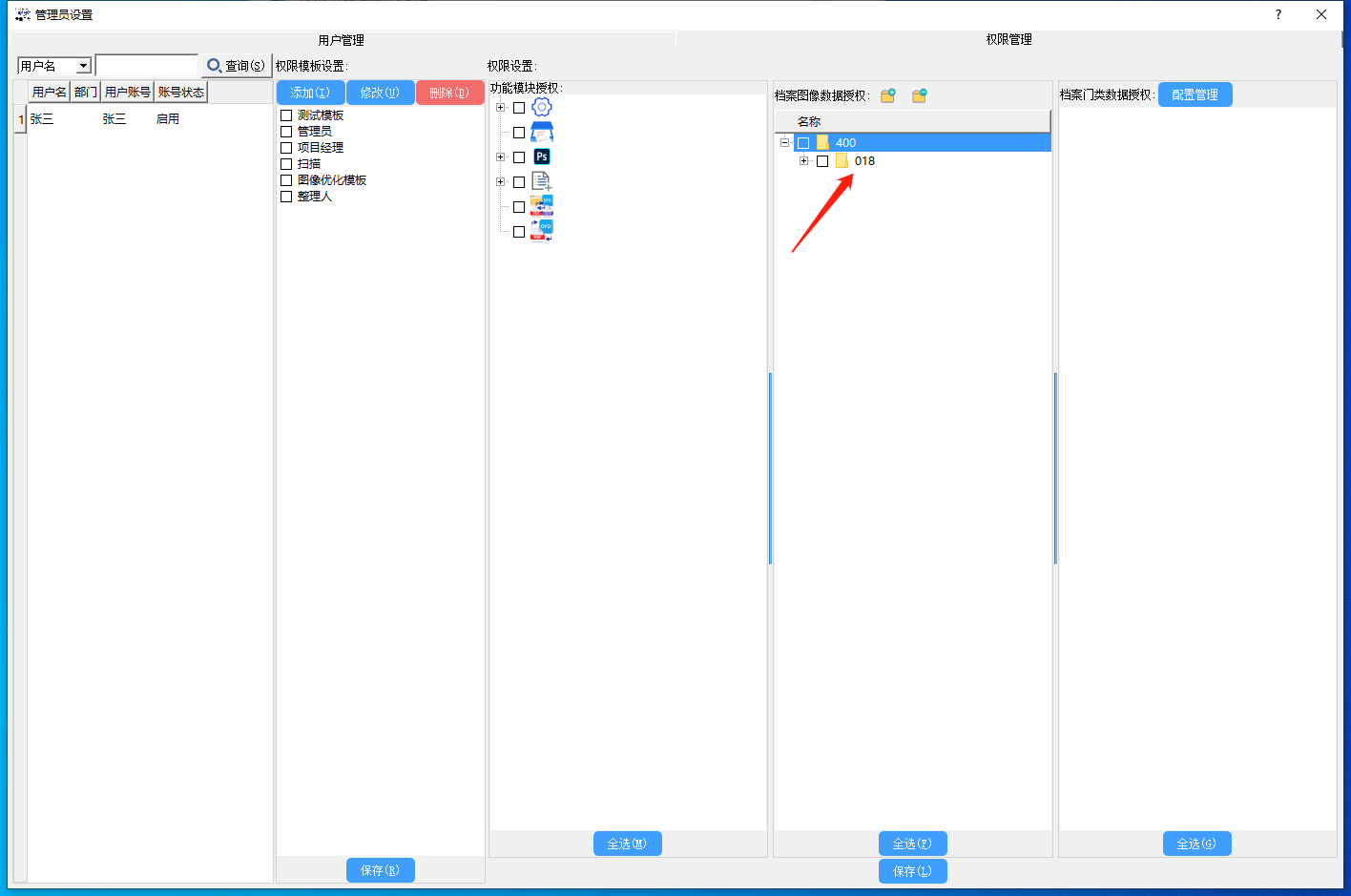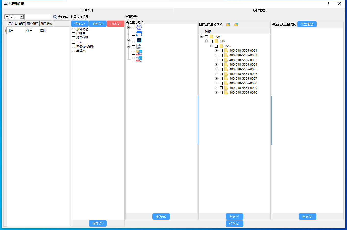 在管理員設(shè)置界面,點擊勾選用戶,在權(quán)限模板設(shè)置欄點擊添加為其添加權(quán)限模板,權(quán)限模板可以直接套用已存在的模板(模板包括功能模塊授權(quán),檔案圖像數(shù)據(jù)授權(quán),檔案門類數(shù)據(jù)授權(quán)的權(quán)限分配設(shè)置),也可自己添加新模板:點擊添加,添加新權(quán)限模板,選擇新權(quán)限模板,在功能模塊授權(quán)欄,檔案圖像數(shù)據(jù)授權(quán)欄和檔案門類數(shù)據(jù)授權(quán)欄為其分配權(quán)限,分配完成后,先點擊右側(cè)保存鍵保存模板的權(quán)限分配選擇,再點擊左側(cè)保存鍵保存賬號的模板選擇。