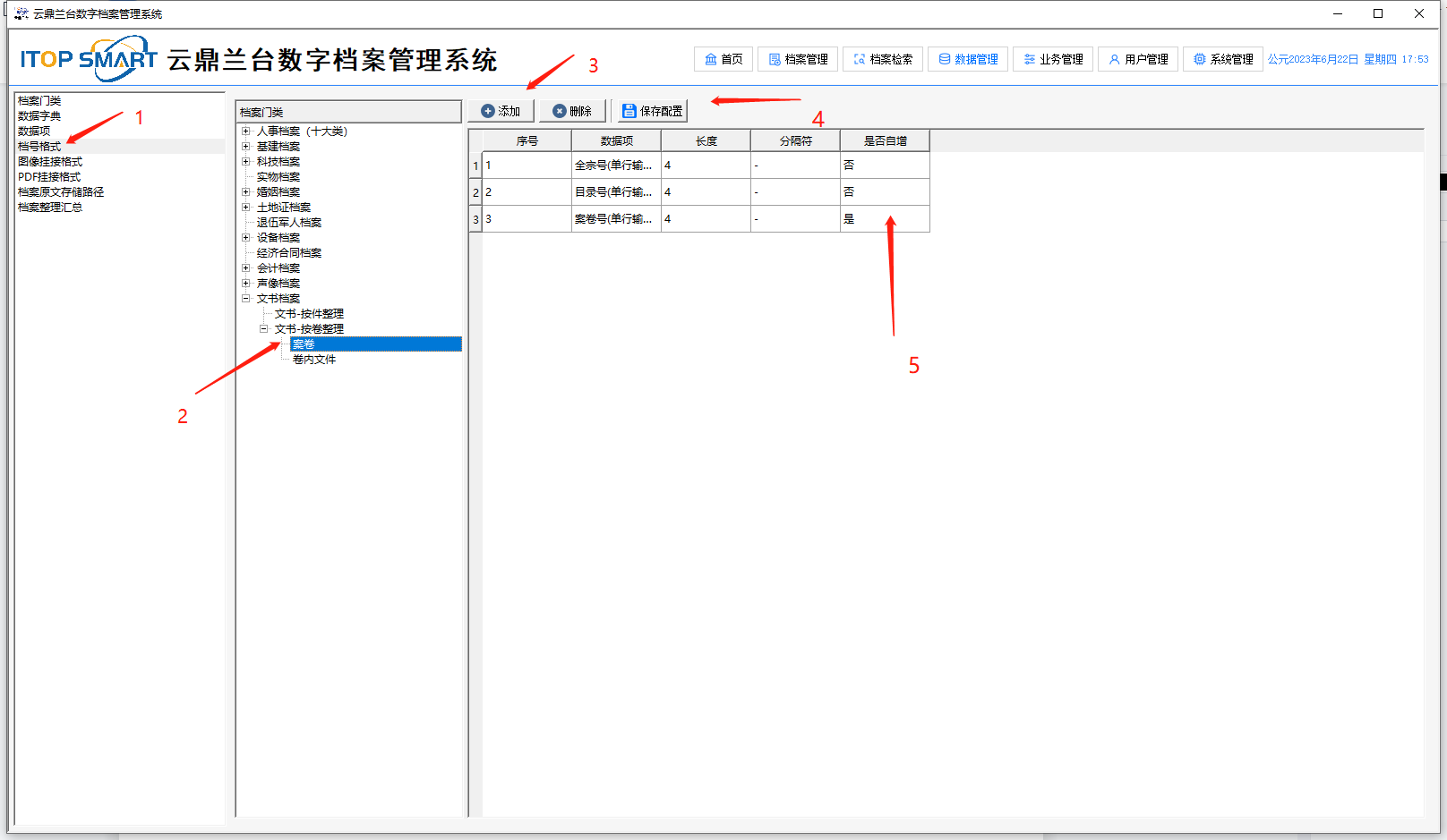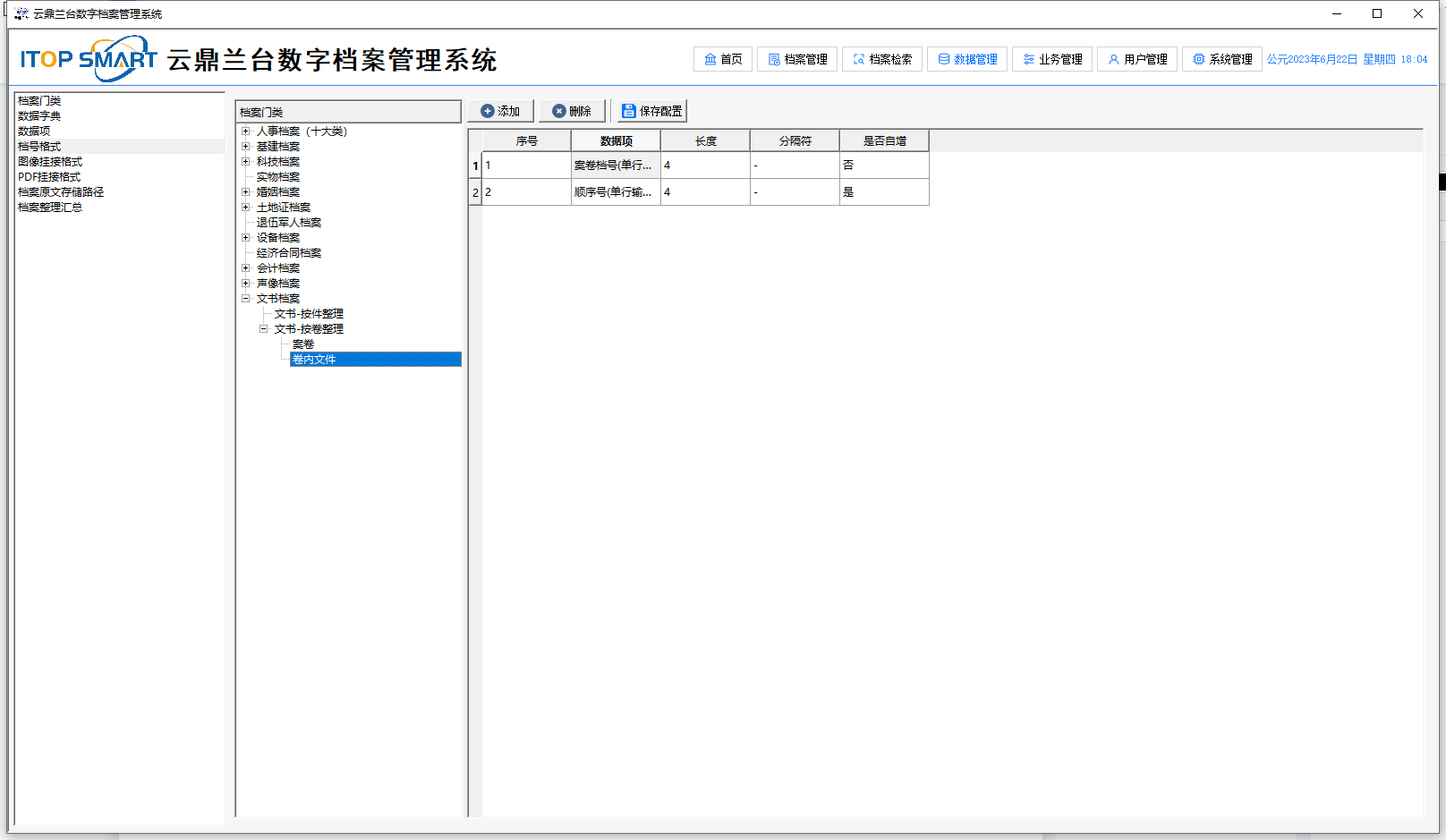 1,點擊檔號格式,選擇需要配置檔號格式的檔案門類,點擊添加進(jìn)行檔號格式配置,案卷級檔案的案卷配置案卷檔號,案卷號是否自增選擇是,卷內(nèi)文件配置卷內(nèi)檔號,順序號或件號是否自增選擇是。一文一件級檔案只需配置檔號,件號的是否自增選擇是。記得配置完成后一定要點擊保存配置。(檔號的格式以實物為準(zhǔn),且檔號組成必須為已添加的數(shù)據(jù)項)