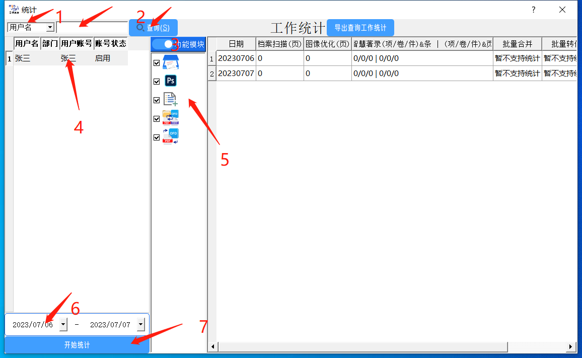 (2),工作量統(tǒng)計:點擊登錄界面左下角的齒輪,在彈出界面點擊工作量統(tǒng)計,登錄管理員賬號,點擊選擇查詢條件,輸入關(guān)鍵詞,點擊查詢出現(xiàn)所要查找的用戶,點擊選擇用戶,點擊選擇所要查詢的工作模塊,選擇要查詢的日期,點擊開始統(tǒng)計,開始統(tǒng)計工作量。
